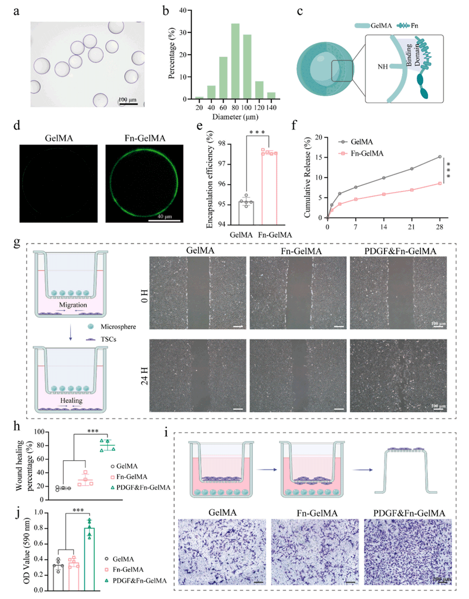 3、缓释生长因子:Fn修饰的GelMA微球通过微流体技术制备,可缓慢释放PDGF-BB,避免生长因子暴释的毒性作用,实现长期稳定的促愈合效果。