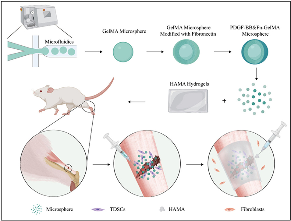 鉴于此,北京大学第三医院王健全教授、黄洪杰副研究员、程锦副研究员等人设计了一种可注射的复合微球/水凝胶膜体系,该体系由负载血小板衍生生长因子-BB(PDGF-BB)和纤连蛋白(Fn)的甲基丙烯酰化明胶(GelMA)水凝胶微球与抗粘连的甲基丙烯酰化透明质酸(HAMA)水凝胶膜组成,旨在促进跟腱愈合并防止粘连。相关研究以“Injectable composite microspheres/hydrogel membranes for Achilles tendon regeneration”为题目,发表在期刊《Materials Today Bio》上。