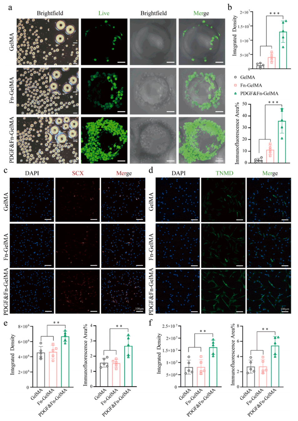 图 2. 水凝胶微球募集肌腱源性间充质干细胞(TDSCs)并诱导其向肌腱细胞分化。(a)细胞在水凝胶微球上捕获和粘附的图像。(b)通过 Image J 分析的整合密度和免疫荧光面积。三组中肌腱特异性标志物硬骨素(SCX)(c)和腱调蛋白(TNMD)(d)的荧光信号。(e)通过 Image J 分析的 SCX 的整合密度和免疫荧光面积。(f)通过 Image J 分析的 TNMD 的整合密度和免疫荧光面积。采用单因素方差分析及 Tukey 事后检验计算统计学显著性,**P < 0.01,***P < 0.001。