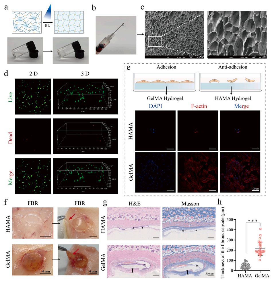 图 3. 甲基丙烯酰化透明质酸(HAMA)水凝胶的合成与表征。(a)HAMA 水凝胶交联过程的示意图及整体外观。(b)HAMA 水凝胶的可注射性。(c)冻干 HAMA 水凝胶的扫描电镜图像。(d)HAMA 水凝胶中包封的 TDSCs 的活 / 死染色结果。(e)细胞在 HAMA 和 GelMA 水凝胶表面粘附的示意图及免疫荧光细胞骨架染色。(f)不同水凝胶(HAMA/GelMA)在大鼠皮下植入 3 天后的抗细胞粘附和异物排斥反应(红色箭头指示:水凝胶周围的纤维囊)。(g)大鼠皮下植入不同水凝胶 3 天后的组织病理学切片的 H&E 和 Masson 染色结果(“*”:水凝胶,“I”:水凝胶周围纤维囊的厚度)。(h)水凝胶周围纤维囊厚度的半定量分析。采用 t 检验计算统计学显著性,***P < 0.001。