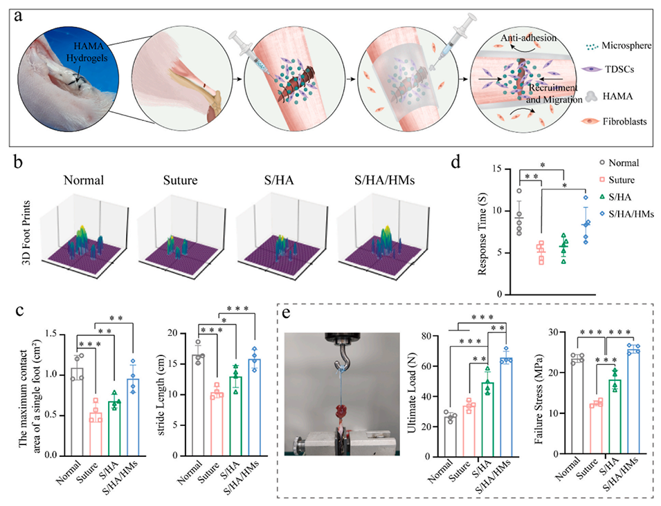 图 4. 复合微球 / 水凝胶膜在大鼠跟腱断裂修复中的行为学和生物力学评估。(a)复合微球水凝胶膜促进内源性肌腱愈合和防止外源性粘连的示意图。(b)SD 大鼠左后肢足底表面的 3D 压力分析。(c)步态分析中单足最大接触面积和步长的定量分析。(d)SD 大鼠后肢置于 55℃热板上的疼痛反应时间。(e)4 周时大鼠跟腱的生物力学性能。采用单因素方差分析及 Tukey 事后检验计算统计学显著性,*P < 0.05,**P < 0.01,***P < 0.001。
