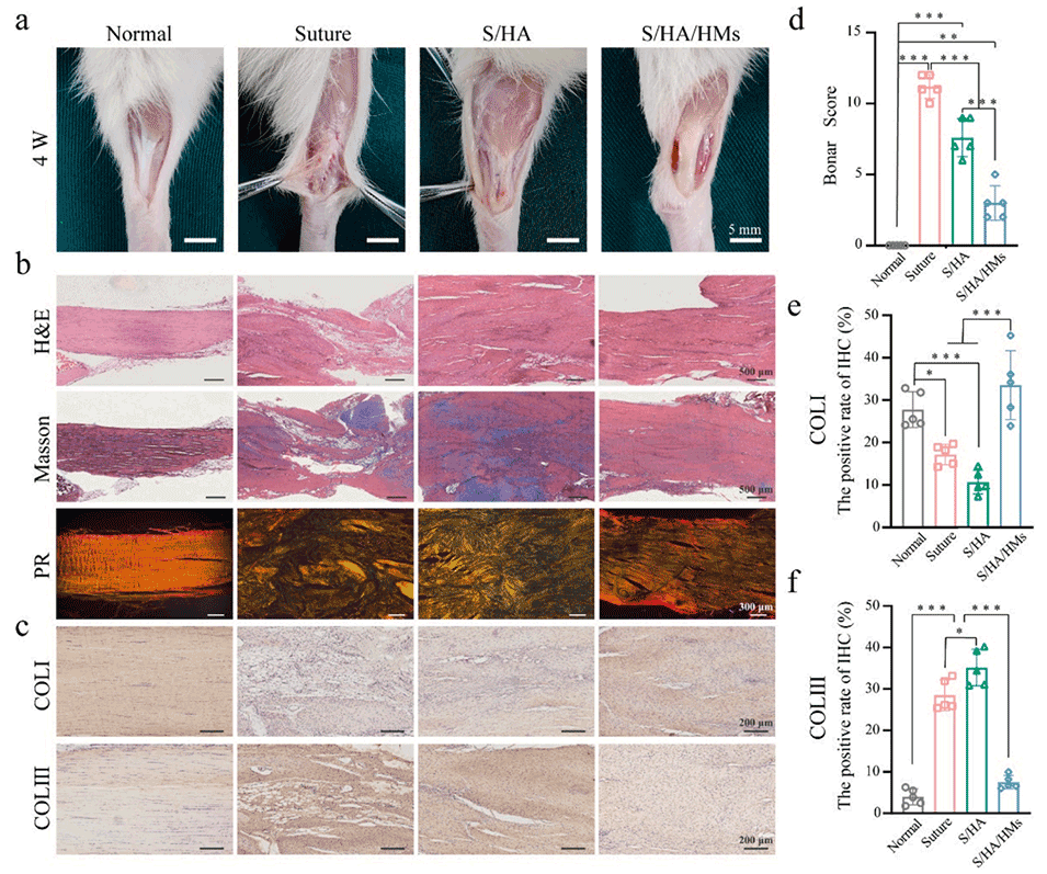 图 5. 复合微球/水凝胶膜对大鼠跟腱断裂模型的修复效果。(a)大鼠跟腱修复后 4 周的宏观外观代表性图像。(b)各组的 H&E、Masson、苦味酸天狼星红(PR)染色代表性图像。(c)I 型胶原(COL-I)和 III 型胶原(COL-III)再生的免疫组织化学染色(棕色)。(d)H&E 染色的跟腱 Bonar 评分。(e)I 型胶原阳性面积占总面积的百分比定量分析。(f)III 型胶原阳性面积占总面积的百分比定量分析。采用单因素方差分析及 Tukey 事后检验计算统计学显著性,*P < 0.05,**P < 0.01,***P < 0.001。