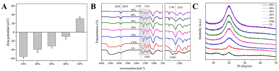 图 1. 不同内相分数(10%、20%、30%、40%、50%)的 O/W₁/W₂ 双乳液的 Zeta(ζ)电位(A)、FTIR 光谱(B)和 XRD 图谱(C)。