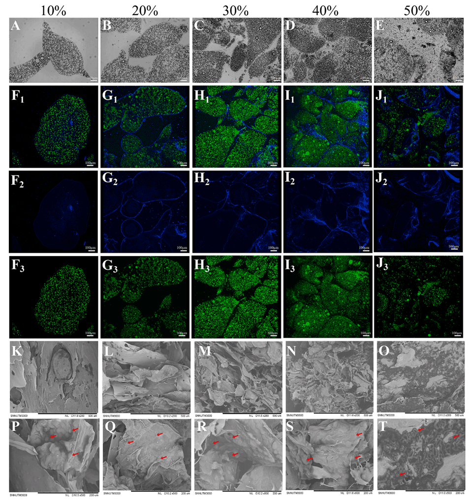 图 2. 不同内相分数(10%、20%、30%、40%、50%)的 O/W₁/W₂ 双乳液的光学显微镜照片(A-E)、共聚焦激光扫描显微镜照片(F-J)和扫描电镜图像(K-O:200×,P-T:500×)。油滴(绿色信号)用尼罗红染色,羧甲基纤维素(蓝色信号)和壳聚糖(蓝色信号)用 Calcofluor white 染色。