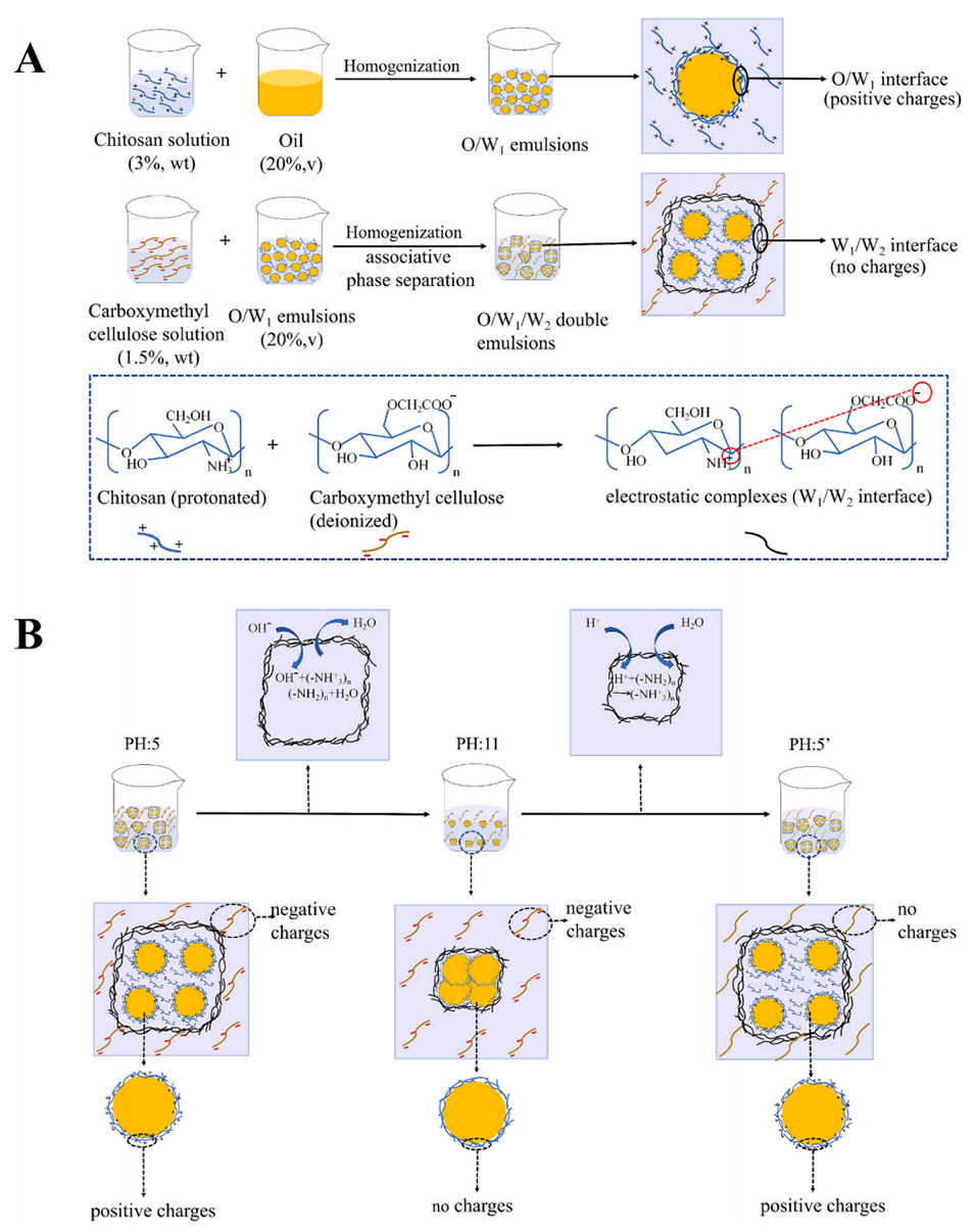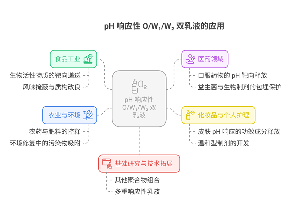 这种O/W₁/W₂双乳液在pH变化时的响应主要体现在结构、尺寸及性能的可逆变化上,具体机制如下: