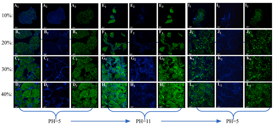 图 4. 不同内相分数(10%、20%、30%、40%)的 O/W₁/W₂ 双乳液在不同 pH 值(pH=5:A-D,pH=11:E-H,pH=5′:I-L)下的共聚焦激光扫描显微镜照片。油滴(绿色信号)用尼罗红染色,羧甲基纤维素(蓝色信号)和壳聚糖(蓝色信号)用 Calcofluor white 染色。
