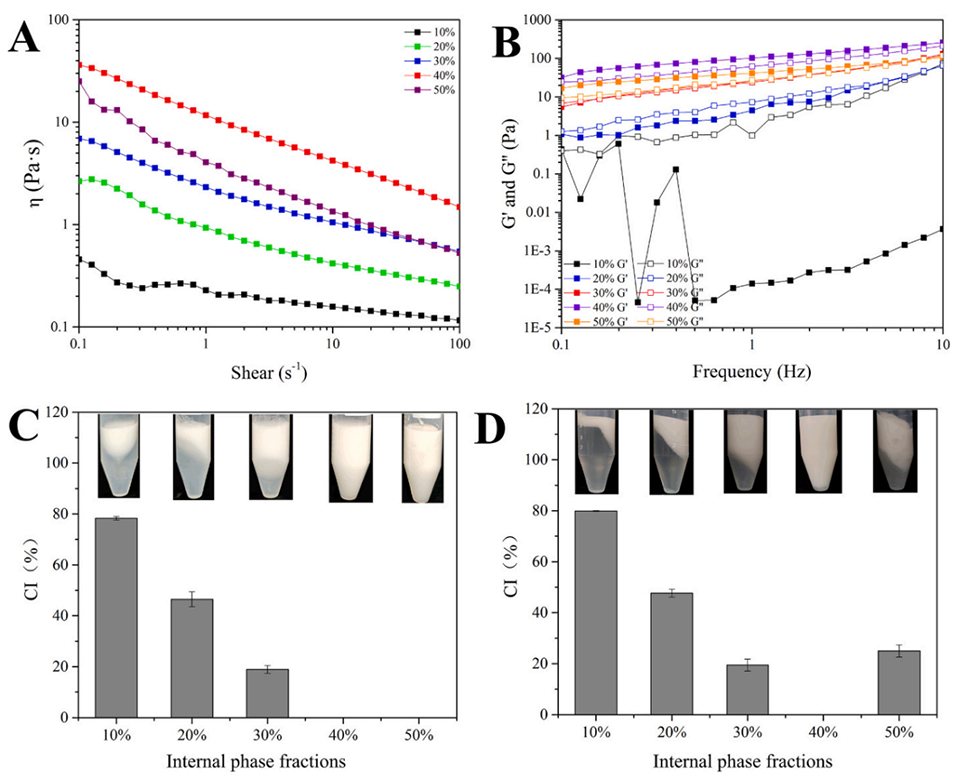 图 3. 不同内相分数(10%、20%、30%、40%、50%)的 O/W₁/W₂ 双乳液的流变学特性和稳定性:表观黏度(A)、频率扫描(B)、离心稳定性(C)、冻融稳定性(D)。
