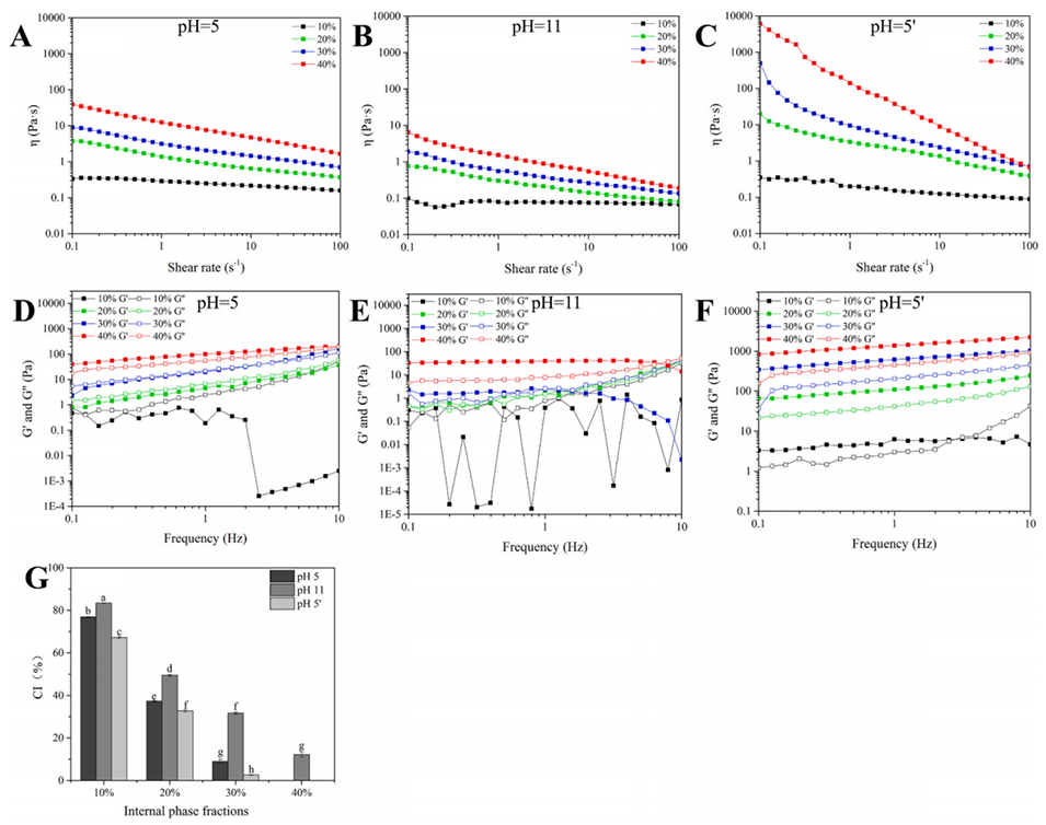 图 5. 不同内相分数(10%、20%、30%、40%)的 O/W₁/W₂ 双乳液在不同 pH 值(5、11、5′)下的流变学特性和稳定性:表观黏度(A:pH=5,B:pH=11,C:pH=5′)、频率扫描(D:pH=5,E:pH=11,F:pH=5′)、离心稳定性(G)。