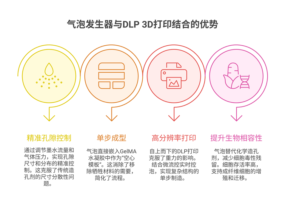 数字光处理(DLP)打印能便捷生成复杂的二维和三维图案,其容器设置便于与微流控装置集成,且相比基于光栅的激光辅助立体光刻(SLA)技术,维护成本更低、固化速度更快,在多孔结构3D打印中潜力巨大。