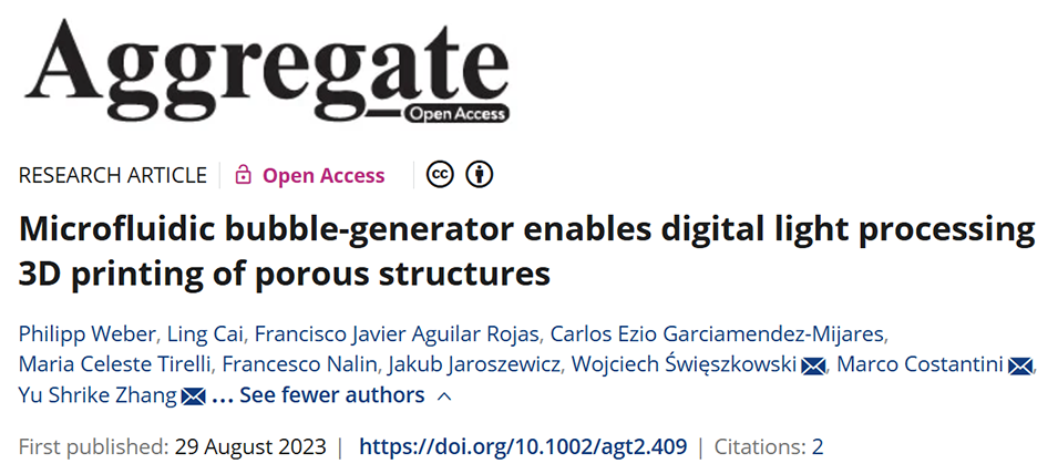 近期,美国哈佛医学院Yu Shrike Zhang教授团队联合波兰科学院物理化学研究所和华沙理工大学材料科学与工程学院等单位,开发了一种集成微流控气泡发生器的数字光处理(DLP)3D打印技术,实现了水凝胶多孔结构的精准可控制造。该研究通过微流控阀式流动聚焦芯片(vFF chip)在甲基丙烯酰化明胶(GelMA)水凝胶前体中生成尺寸可调(143-747μm)、分布均匀的气泡,结合自上而下式DLP打印系统,成功制备了具有复杂几何形状的仿生多孔支架;细胞实验证实,该支架支持成纤维细胞的高存活率、增殖及迁移,为组织工程提供了高效的单步成型新策略。相关研究以“Microfluidic bubble-generator enables digital light processing 3D printing of porous structures”为题发表于期刊《Aggregate》。
