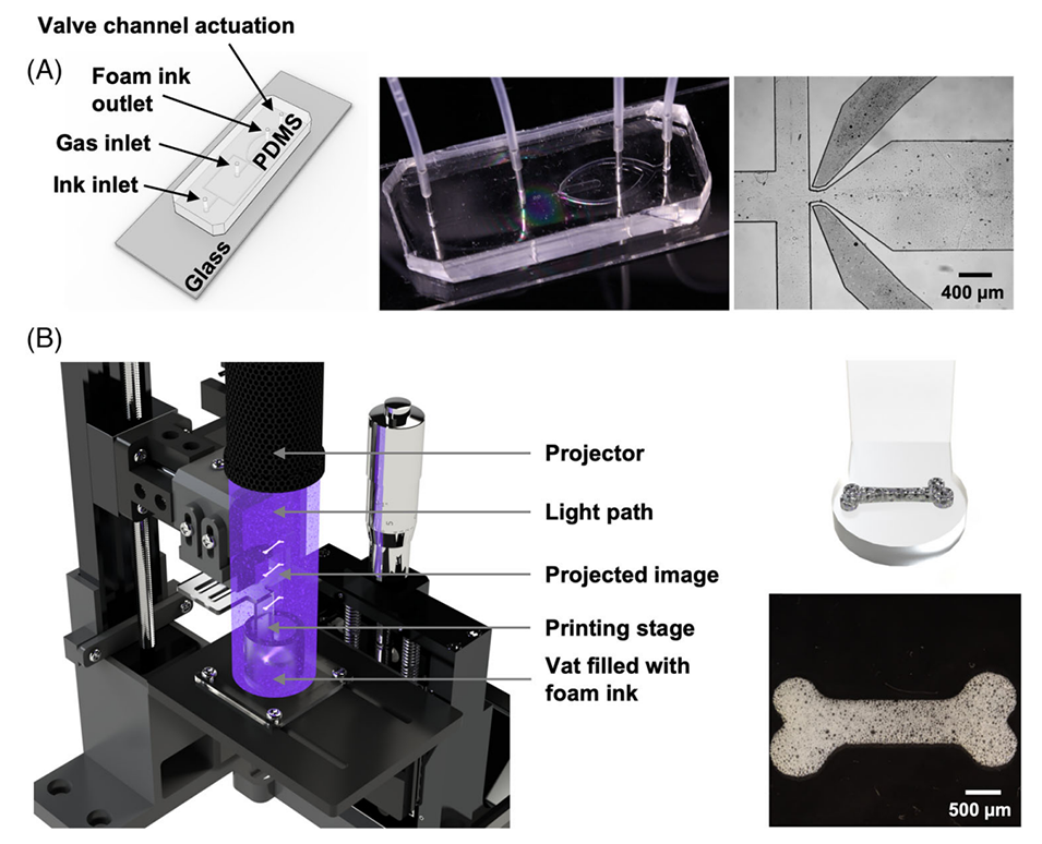 图 1(A)展示了阀式流动聚焦(vFF)芯片的结构,突出显示了其两个气体入口、一个墨水入口以及生成气泡的出口。(B)所开发的数字光处理(DLP)自上而下式 3D 打印机的近景特写图,打印平台插入到容器中,光源从投影仪照射到打印平台上。右侧图像上方为打印平台上类骨结构的打印示意图,下方为该类骨多孔结构的实际打印图。