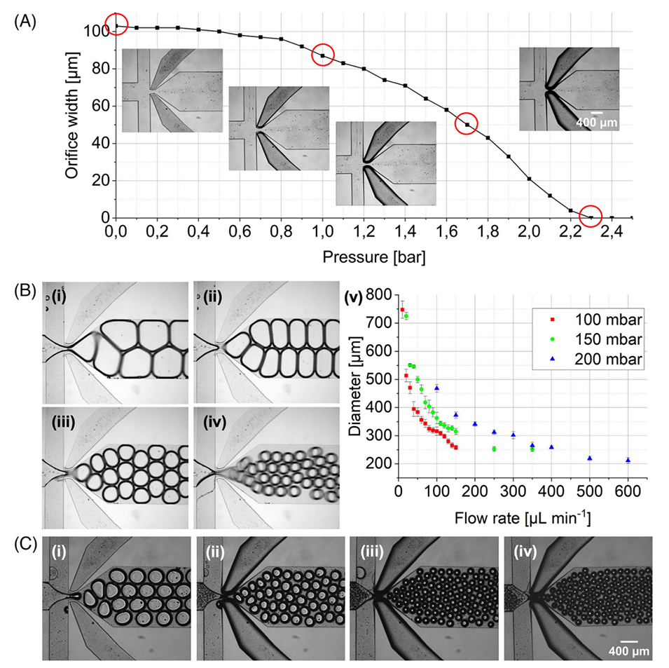 图 2(A)定量显示了阀式流动聚焦(vFF)芯片的孔口宽度随 pv=0–2.5 bar 变化的减小情况。显微镜图像展示了 vFF 芯片孔口在 0、1.0、1.7、2.3 bar 不同压力下的状态。(B)在恒定施加压力 pg=150 mbar、墨水流量分别为 20、30、80、350 µL min-1 且 Pv 恒定为大气压的条件下,vFF 芯片内气泡尺寸可控性的显微镜图像(i-iv)。(v)三种不同施加压力 pg 下,平均气泡尺寸及其标准偏差随流量的量化关系。(C)通过对 vFF 芯片孔口施加压力 pv 进一步减小气泡尺寸。孔口压力 pv 在 0–2.2 bar 范围内变化,可使气泡平均尺寸最小降至 143±7 µm。