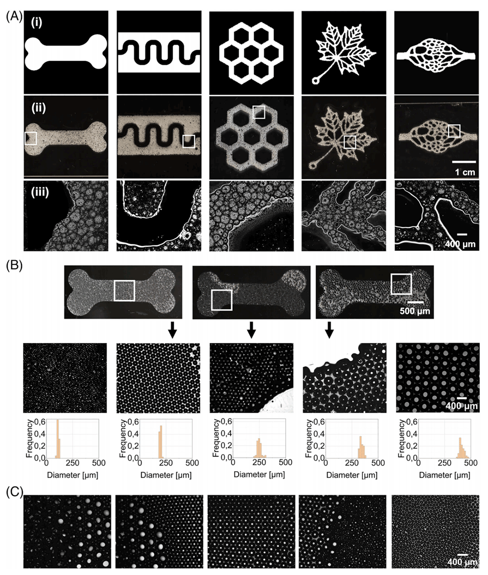 图 3(A)复杂程度各异的计算机生成 2D 形状用于数字光处理(DLP)打印机进行单层打印(i);2D 打印形状(ii);2D 打印形状的放大显微图及生成气泡的展示(iii)。(B)具有可控气泡尺寸的 2D 打印多孔类骨结构。显微镜图像展示了 5 种不同气泡尺寸,平均尺寸范围为 112–424 µm。每种气泡尺寸的直方图均基于 n>40 次测量。(C)2D 打印的气泡尺寸梯度,展示了可尺寸调节的小、中、大尺寸气泡的生成情况。