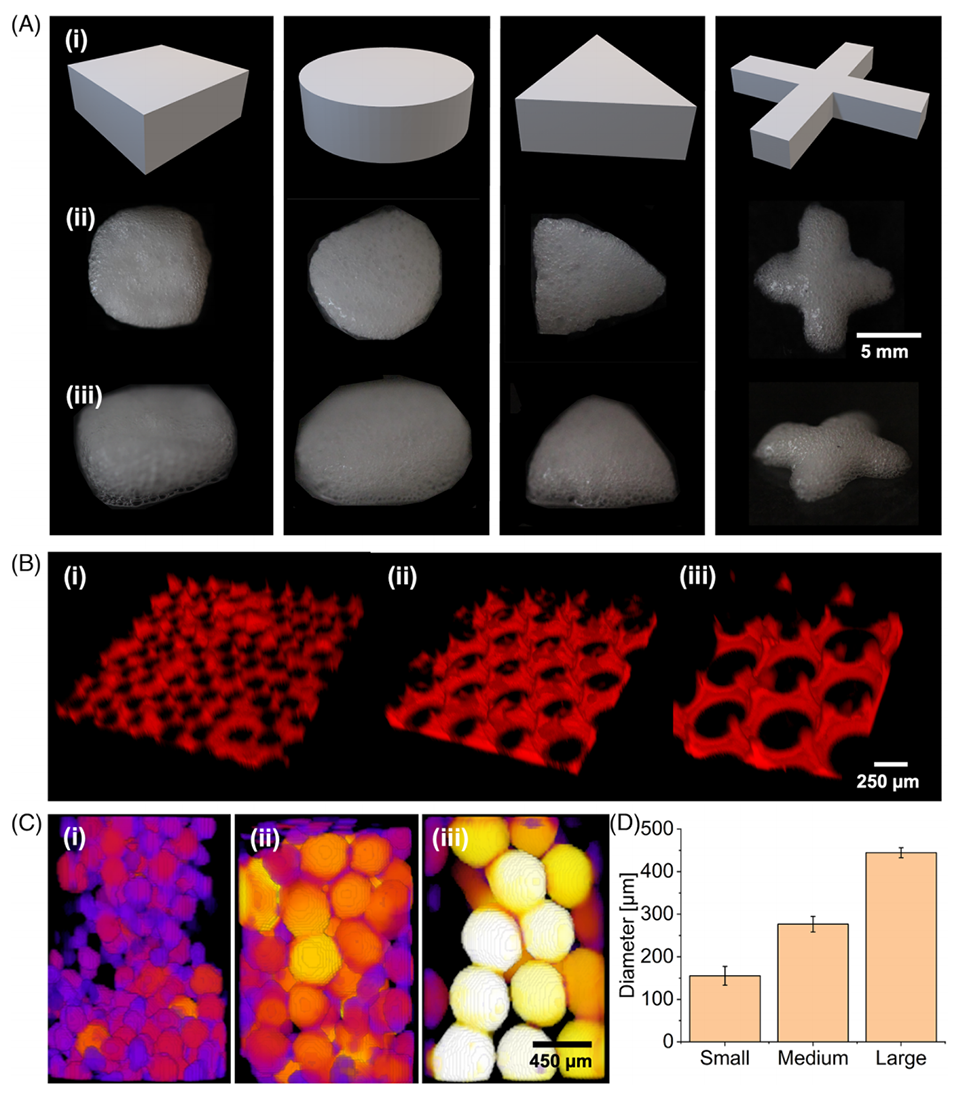 图 4(A)用于 3D 数字光处理(DLP)打印的计算机辅助设计(CAD)模型(i)。使用自上而下式 DLP 打印机打印的 3D 多孔结构的俯视图(ii)和侧视图(iii)。每个模型总高度为 4 mm,共 20 层,每层 200 µm,每层采用 405 nm 光曝光 5 s。(B)共聚焦荧光显微图,展示了罗丹明标记的 fGelMA 水凝胶中单层小(i)、中(ii)、大(iii)尺寸气泡的空间形态。(C)小(i)、中(ii)、大(iii)尺寸气泡的显微 CT 扫描图,以及(D)它们的平均尺寸和标准偏差量化结果。