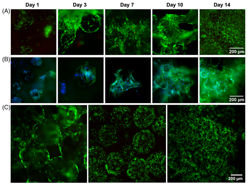 图 5(A)荧光显微图像定性显示了在由 fGelMA 和卵磷脂稳定的墨水打印的多孔结构中,接种的 NIH/3T3 成纤维细胞在培养 1、3、7、10、14 天后的高存活率,图中为活细胞(绿色)和死细胞(红色)的叠加图像。(B)在由 fGelMA 和卵磷脂稳定的墨水打印的多孔结构中,培养 1、3、7、10、14 天后 NIH/3T3 成纤维细胞的形态,展示了其 F - 肌动蛋白丝(绿色)和细胞核(蓝色)。(C)在具有精确控制(大、中、小尺寸)气泡的多孔支架中,成纤维细胞培养 7 天后的活(绿色)死(红色)染色结果。