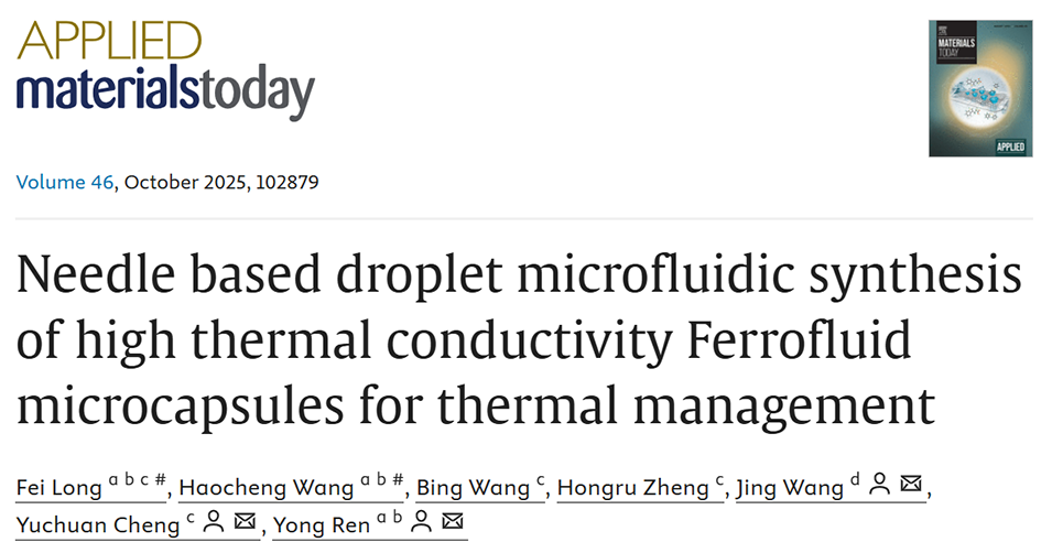 高效散热仍然是先进热管理系统的关键挑战,特别是在高性能电子和能源密集型应用中。近期,宁波诺丁汉大学任勇教授、王静与中国科学院宁波材料所程昱川研究员等人合作,开发了一种基于针式微流控技术的高导热铁磁流体微胶囊(OMF-HDDA)。该微胶囊通过磁场调控可实现热导率与刚度的协同提升,在电子芯片冷却测试中,其散热效率较传统冷却剂提升36.86%。相关研究以“Needle based droplet microfluidic synthesis of high thermal conductivity Ferrofluid microcapsules for thermal management”为题目,发表于期刊《Applied Materials Today》。
