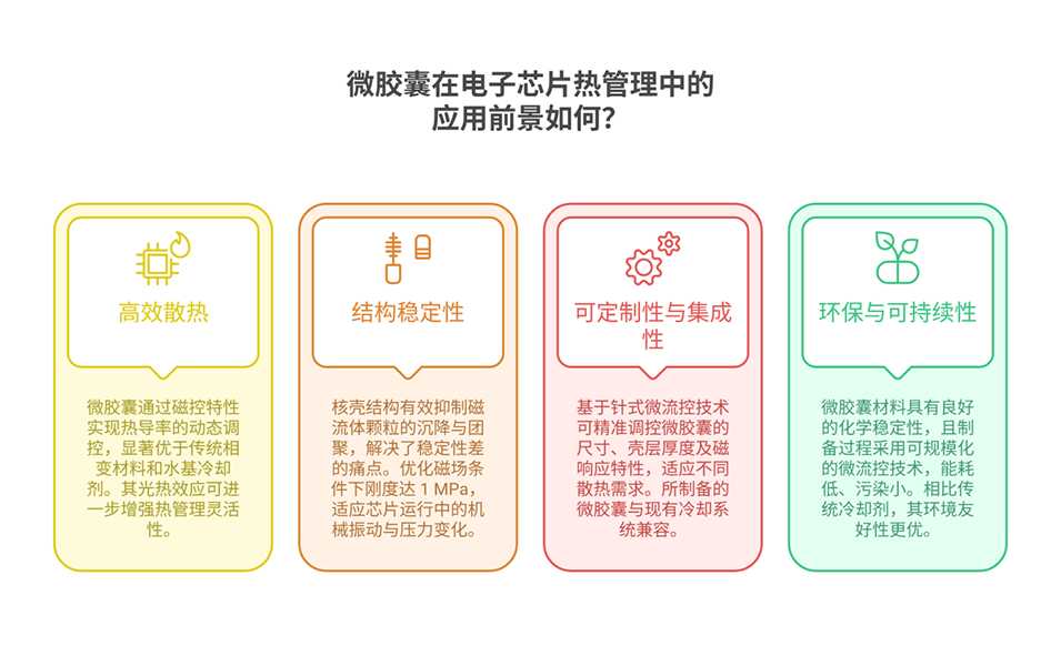 4、在交变磁场下,微胶囊的光热效应证实其能通过发热实现能量转换;电子芯片冷却测试中,其散热效率比传统冷却剂提高36.86%。