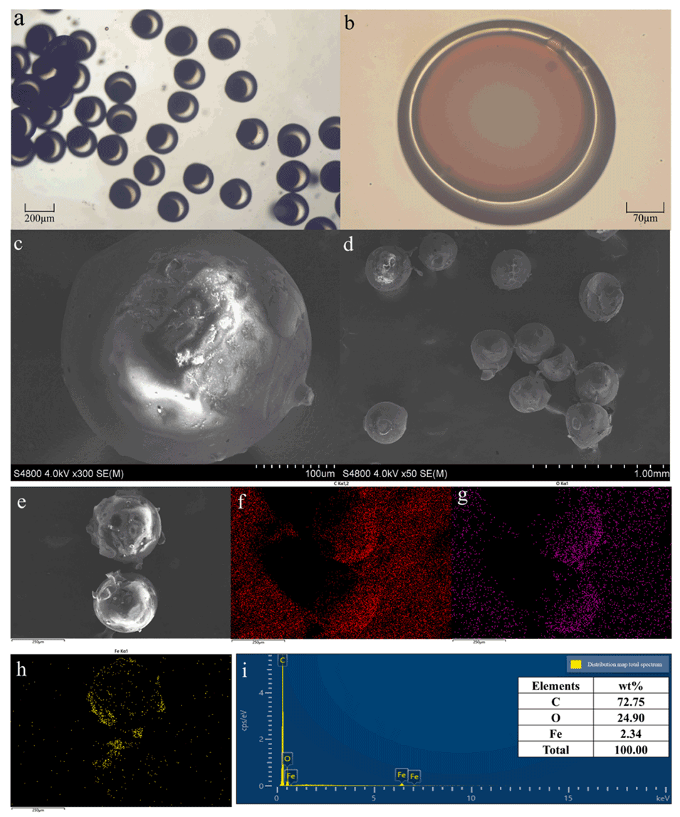图4.(a)高度均一的球形 OMF-HDDA 微胶囊。(b)生成的微胶囊,内核直径(di)为 348.16μm,外径(do)为 406.87μm。(c)单个完整的 OMF-HDDA 微胶囊,(d)扫描电镜(SEM)下经挤压后的微胶囊。(e)OMF-HDDA 微胶囊的 SEM 图像(上方为挤压后的微胶囊,下方为完整未破损的微胶囊)。OMF-HDDA 微胶囊的能谱分析:(f-h)分别为碳(C)、氧(O)、铁(Fe)元素的分布。(i)总谱分布图。