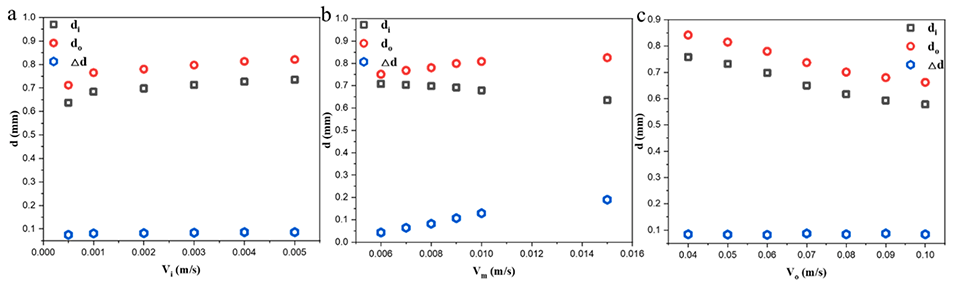 图5.(a)在中间相流速 Vm=0.01m/s、外相流速 Vo=0.08m/s 条件下,内相流速对微胶囊尺寸的影响。(b)在内相流速 Vi=0.002m/s、外相流速 Vo=0.08m/s 条件下,中间相流速对微胶囊尺寸的影响。(c)在内相流速 Vi=0.002m/s、中间相流速 Vm=0.01m/s 条件下,外相流速对微胶囊尺寸的影响。