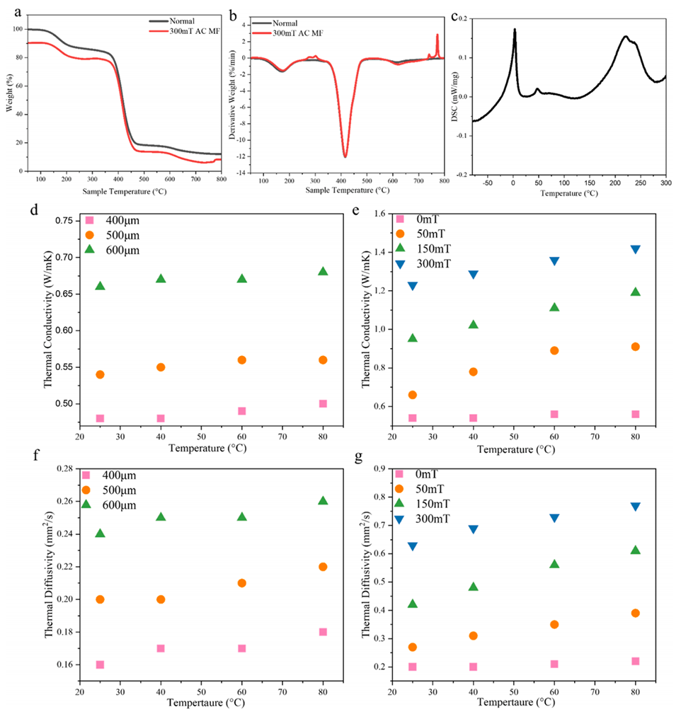 图7.(a)500μm 的 OMF-HDDA 微胶囊在有无磁场条件下的重量变化,(b)重量变化率。(c)OMF-HDDA 微胶囊的差示扫描量热(DSC)分析结果。(d)正常条件下 OMF-HDDA 微胶囊的导热系数,(f)热扩散系数。(e)在 0mT 至 300mT 磁场环境下 OMF-HDDA 微胶囊的导热系数,(g)热扩散系数。