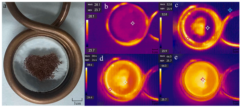 图9.(a)将 OMF-HDDA 微胶囊排列成心形并置于交变磁场线圈中。在交变磁场作用下,利用红外热像仪监测微胶囊随时间的热行为和温度变化。观测时间点如下:(b)施加交变磁场后即刻(t=0min),(c)t=5min 时,(d)t=8min 时,(e)t=10min 时。