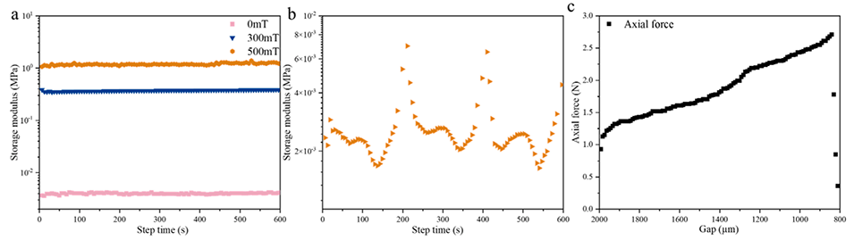 图8.(a)OMF-HDDA 微胶囊在直流磁场下的储能模量,(b)在不规则交变磁场下的储能模量。(c)OMF-HDDA 微胶囊所能承受的压缩力。