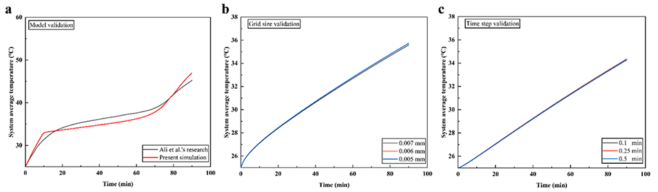 图10.(a)模型验证。(b)网格尺寸验证。(c)OMF-HDDA 微胶囊散热模拟的时间步长验证。