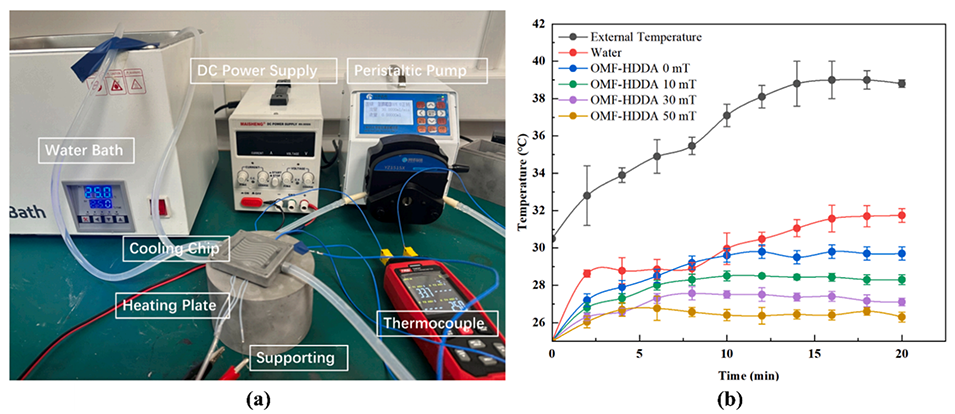 图12.(a)芯片散热实验系统。(b)散热过程中的温度变化。误差棒代表三次重复实验的标准偏差。