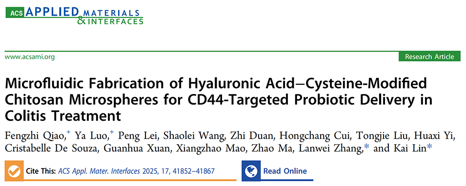 益生菌在调节肠道免疫稳态和支持肠道健康方面发挥着至关重要的作用。然而,口服给药面临非特异性分布、疗效低等挑战。为了实现精确高效的递送,中国海洋大学食品科学与工程学院张兰威教授、林凯副教授等人通过微流控技术将透明质酸(HA)与半胱氨酸修饰的壳聚糖(CCH)共价连接,构建了靶向结肠炎症部位CD44受体的益生菌递送系统,将两株益生菌包封于修饰后的壳聚糖基质中形成微球,实现了益生菌在炎症部位的精准定位与高效递送,有效改善结肠炎症状。相关研究以“Microfluidic Fabrication of Hyaluronic Acid–Cysteine-Modified Chitosan Microspheres for CD44-Targeted Probiotic Delivery in Colitis Treatment”为题目,发表在期刊《ACS Applied Materials & Interfaces》上。