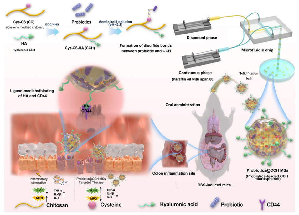 1、本研究构建了一种基于微流控技术的透明质酸-半胱氨酸修饰壳聚糖(CCH)微球靶向递送系统,用于将益生菌精准递送至结肠炎炎症部位的CD44受体,以提升益生菌在结肠炎治疗中的效果。