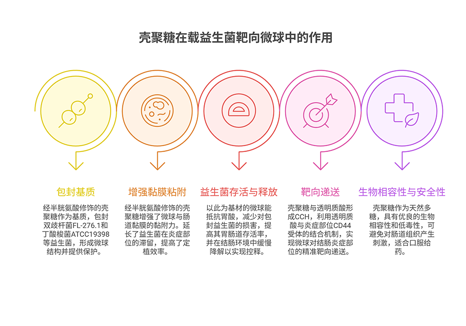 3、借助透明质酸(HA)与CD44的受体-配体结合机制,以及半胱氨酸修饰壳聚糖赋予的肠黏膜黏附特性,该微球对炎症性Caco-2细胞捕获率高,在DSS诱导的结肠炎小鼠模型中能延长滞留并靶向定位。