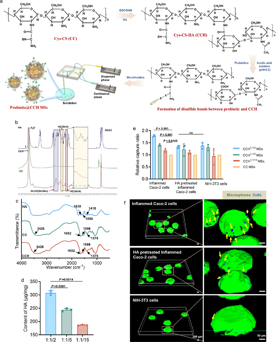 图 1. CCH 微球的合成与表征。(a)益生菌@CCH 微球的制备与合成流程示意图:透明质酸(HA)首先通过酰胺反应与巯基修饰的壳聚糖结合,随后益生菌通过二硫键与半胱氨酸残基连接,最终利用微流控技术获得益生菌@CCH 微球。(b)氢核磁共振(¹H NMR)谱图和(c)傅里叶变换红外(FTIR)光谱证实 HA 接枝到半胱氨酸修饰壳聚糖(CC)上形成了 CCH。(d)CCH1:1/2、CCH1:1/5和 CCH1:1/15 中接枝的 HA 含量。(e)不同 HA 含量的 CCH 微球对炎症性 Caco-2 细胞、HA 预处理的 Caco-2 细胞及 NIH-3T3 细胞的相对捕获效率。(f)通过共聚焦激光扫描显微镜(CLSM)观察 FL-276.1@CCH1:1/2 微球捕获的细胞数量。绿色荧光代表包埋在 CCH 微球中的 FL-276.1(经绿色 SYTO9 染色标记),蓝色荧光代表经 DAPI 染色的细胞核。