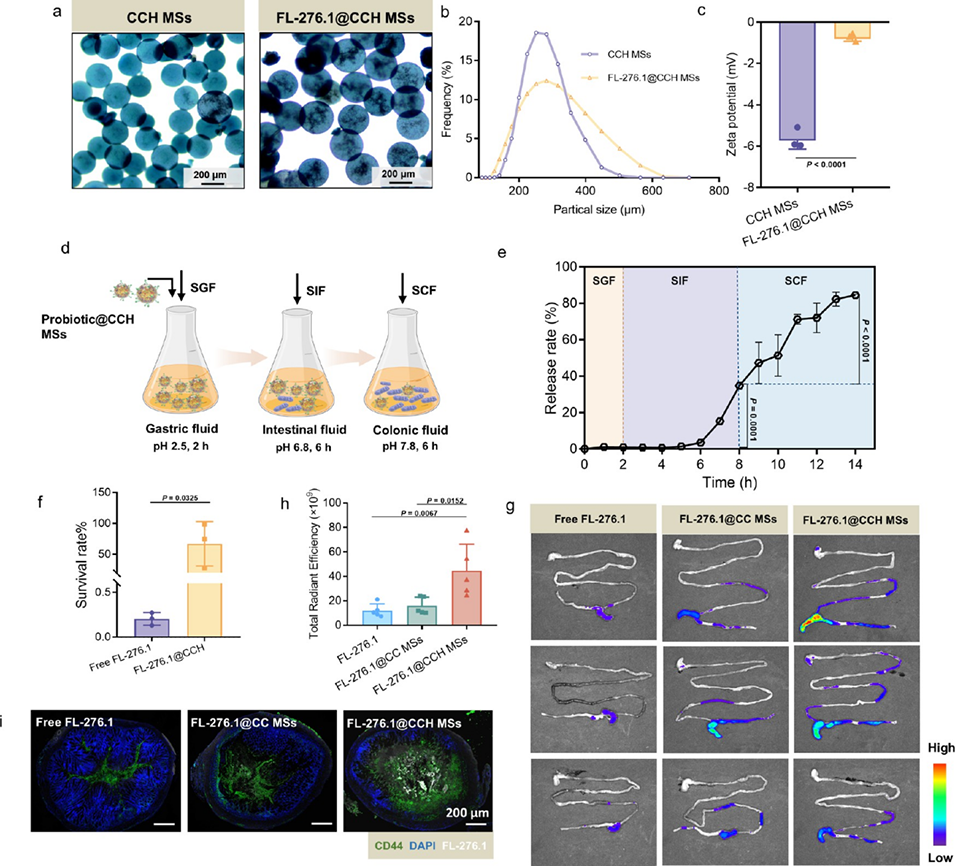 图 2. FL-276.1@CCH 微球的性能表征。(a)CCH 的光学显微镜图像、(b)粒径分布以及(c)zeta 电位值。(d)FL-276.1@CCH 微球的体外模拟消化过程示意图,具体为 5 mL 模拟胃液(SGF,pH=2.5,m/v=9:1)处理 2 小时、模拟肠液(SIF,pH=2.5,v/v=1:4)处理 6 小时、模拟结肠液(SCF,pH=7.8,v/v=1:2)再处理 6 小时。(e)随着消化时间延长,包封的 FL-276.1 的释放曲线。(f)游离 FL-276.1 和 FL-276.1@CCH 微球经模拟胃液处理 2 小时后的存活率。(g)利用 IVIS 成像系统观察 FL-276.1@CCH 微球在小鼠肠道中的荧光分布;(h)各组结肠荧光的总辐射效率。(i)免疫荧光共定位:绿色荧光信号代表与抗 CD44 染色结合的 CD44 受体,蓝色代表经 DAPI 染色的细胞核,白色代表 FL-276.1@CCH 微球。
