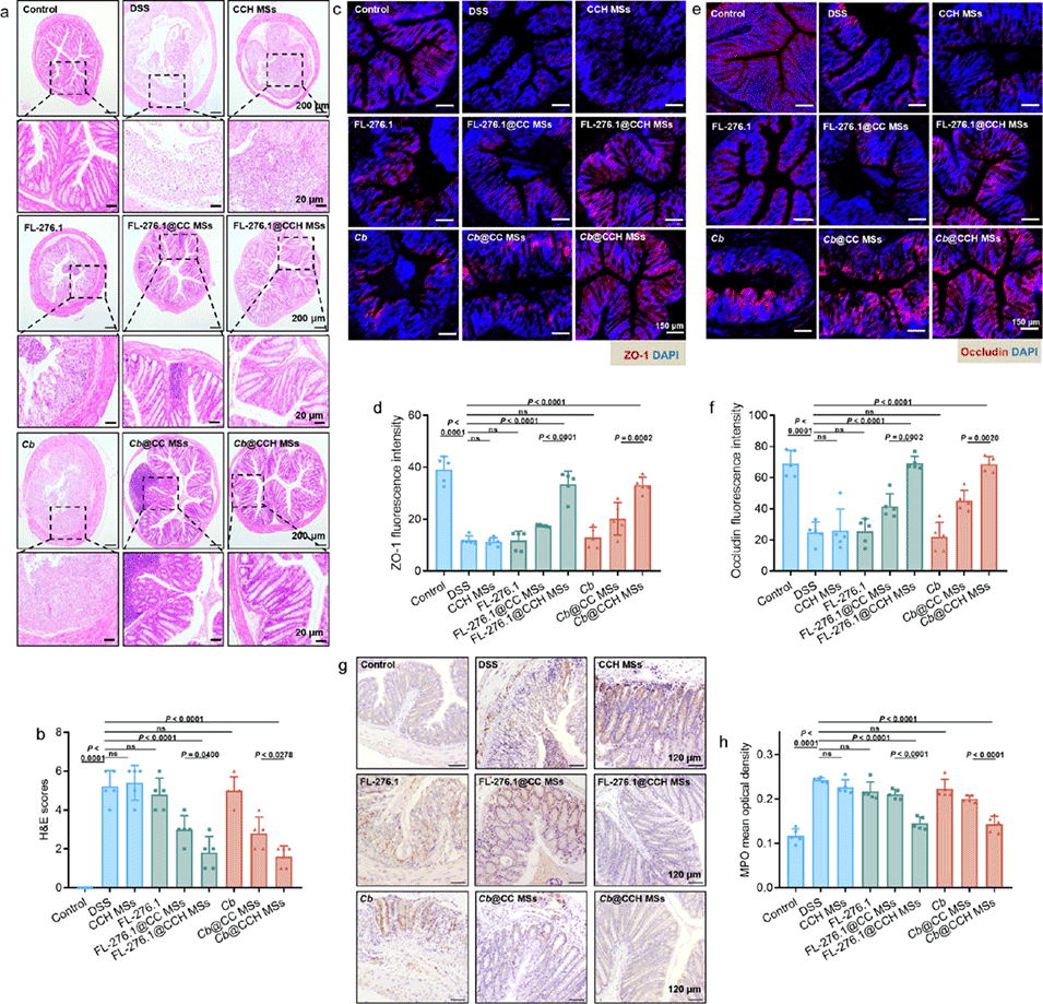 图 4. 肠道理化屏障的维持。(a)结肠组织的 H&E 染色图像及(b)H&E 评分,比例尺 = 200 μm 和 20 μm(放大图)。(c)ZO-1 和(e)闭合蛋白(occludin)在结肠中表达的免疫荧光染色典型图像,比例尺 = 150 μm。(d)ZO-1 和(f)闭合蛋白的荧光强度:红色荧光代表 ZO-1 和闭合蛋白的表达,蓝色代表经 DAPI 染色的细胞核。(g)近端结肠的髓过氧化物酶(MPO)染色代表性图像及(h)MPO 平均光密度,比例尺 = 120 μm。