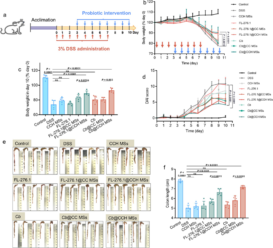 图 3. FL-276.1@CCH 微球和 Cb@CCH 微球益生菌递送系统对 DSS 诱导结肠炎的治疗效果。(a)DSS 诱导结肠炎模型干预实验方案示意图。(b)各组经灌胃给药后的每日体重变化(n=9),红色箭头表示 0-7 天给予 3% DSS,蓝色箭头表示 3-10 天进行益生菌干预。(c)第 10 天的体重;(d)疾病活动指数(DAI)评分(n=9);(e)结肠宏观照片;(f)治疗后的结肠长度变化(n=5)。