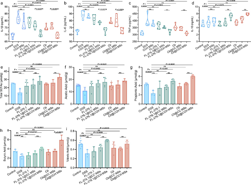 图 5. 减轻 DSS 诱导的结肠炎小鼠炎症及调节肠道代谢物短链脂肪酸(SCFAs)含量。小鼠血清中炎症因子水平:(a)IL-1β、(b)IL-6、(c)TNF-α 和(d)IL-10 的水平。小鼠肠道代谢产生的粪便中的 SCFAs 含量:(e)总 SCFAs;(f)乙酸;(g)丙酸;(h)丁酸;(i)戊酸。