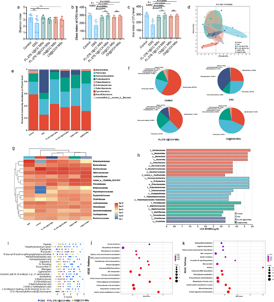 图 6. 调节肠道菌群相对丰度以治疗炎症性肠病。(a)操作分类单元(OTU)水平上的 Shannon 指数、(b)Chao 指数和(c)Ace 指数。(d)通过主成分分析(PCA)展示的肠道菌群 β 多样性。(e)门水平肠道菌群相对丰度直方图及(f)组成饼图。(g)科水平肠道菌群组成的热图分析。(h)线性判别分析。(i)基于不同代谢物相对含量的 Z 评分图。(j)DSS 组与 FL-276.1@CCH 微球组、(k)DSS 组与 Cb@CCH 微球组差异代谢物的京都基因与基因组百科全书(KEGG)富集图。