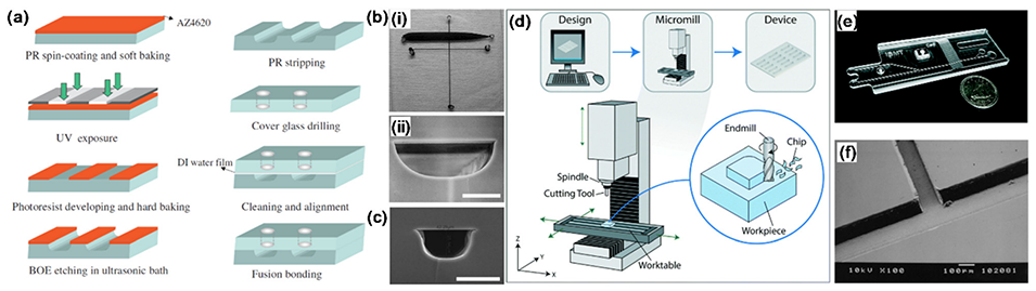 图 5. (a) 钠钙玻璃微流控设备的微制造步骤示意图。PR:AZ4620 光刻胶;BOE:缓冲氧化物蚀刻;DI water:去离子水。(b) 密封的钠钙玻璃微流控设备图像,通道内填充黑色染料并带有 1.2mm 钻孔 (i),以及微通道横截面的扫描电子显微镜图像 (ii)。比例尺:40μm。(c) 高宽比>0.5 的钠钙玻璃微通道的扫描电子显微镜横截面图像。比例尺:40μm。(d) 计算机数控铣床制造微流控芯片的步骤示意图。(e) 热塑性芯片的照片。(f) PMMA 中实现的微通道 T 型结的扫描电子显微镜图像。比例尺:100μm。
