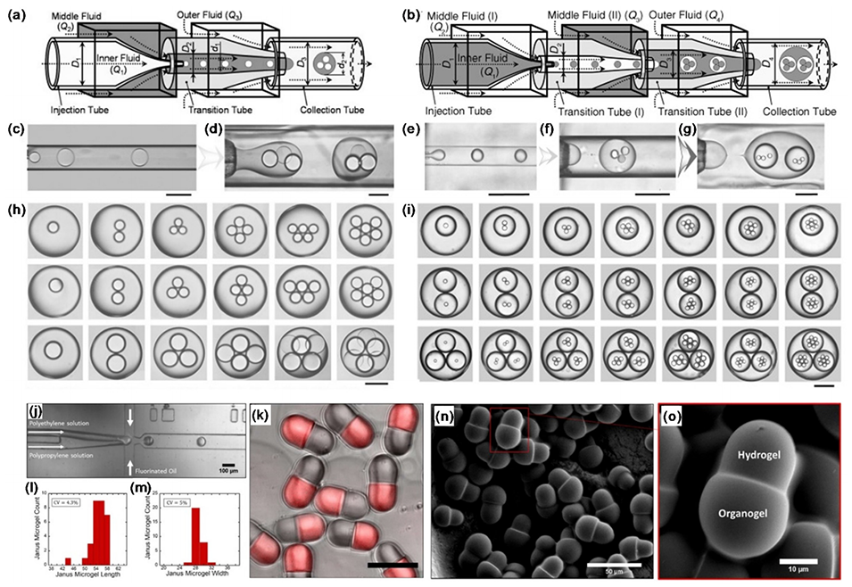 图 4. (a) 和 (b) 用于制备双乳液 (a) 和三重乳液 (b) 的几何结构示意图。相应乳化阶段的光学显微图如 (c)-(g) 所示。(h) 双乳液的光学显微图,显示内液滴数量(从左到右)和直径(从上到下)逐渐增加。(i) 三重乳液的光学显微图,显示内液滴数量(从左到右)和中间液滴数量(从上到下)逐渐增加。(c)-(i) 的比例尺:200μm。(j) 流动聚焦微流控设备中 Janus 液滴形成的光学显微图。比例尺:100μm。(k) 具有亲水(灰色)和疏水(红色)组分的 Janus 微凝胶图像。比例尺:50μm。(l)-(m) Janus 粒子长度 (l) 和宽度 (m) 的分布。(n) Janus 粒子的扫描电子显微镜图像。比例尺:50μm。(o) (n) 中红色方框标记的单个 Janus 粒子的放大图。比例尺:10μm。