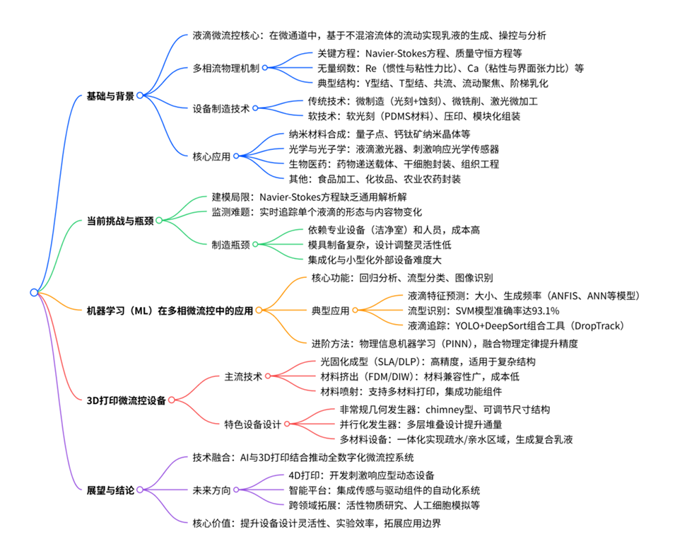 液滴微流控技术在纳米材料合成、光子学、药物递送、再生医学、食品科学、化妆品和农业等多个领域都有重要的应用价值。尽管在微通道中液滴生成的基本机制和液滴生成装置的制造方面取得了显著进展,但在预测液滴性质和追踪单个液滴方面仍面临挑战。AI和3D打印技术的出现为模拟流体行为、精确追踪液滴以及探索创新装置设计提供了前所未有的机会。