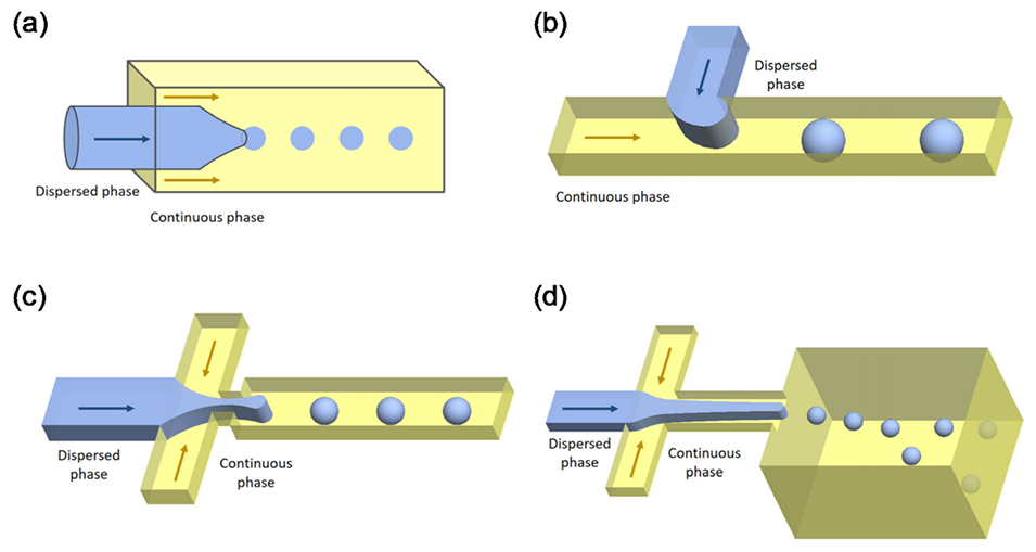 图 2. 微流控设备中液滴发生器几何结构的示意图:(a) 共流、(b) 交错流、(c) 流动聚焦、(d) 阶梯乳化。