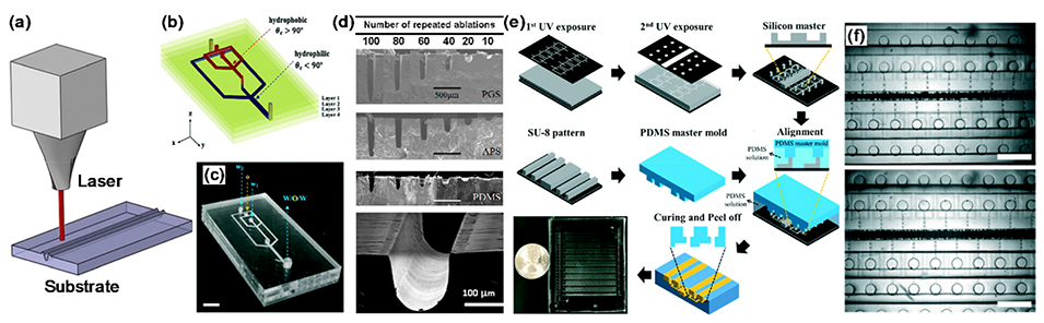 图 6. (a) 塑料基板激光微结构化示意图。(b) 和 (c) 通过键合 PMMA 薄片制成的多层液滴生成微流控设备的示意图 (b) 和照片 (c),这些薄片通过 CO₂激光微制造而成。(c) 中的比例尺:5mm。(d) 激光烧蚀通道的扫描电子显微镜横截面图像,分别在聚甘油癸二酸酯(PGS,顶部图像)、聚(1,3 - 二氨基 - 2 - 羟基丙烷 - co - 多元醇癸二酸酯)(APS,中上部图像)和 PDMS(中下部图像)中制成。从左到右,通道由逐渐减少的激光脉冲数制成。比例尺:500μm。底部图像为 PGS 中单个微通道的放大扫描电子显微镜图像。比例尺:100μm。(e) 用于高通量液滴生成的 3D 整体弹性体设备的制造过程说明。左下图像显示与基板键合后制成的设备照片。(f) 3D 设备运行时的光学图像,显示在并行流动聚焦结中同时生成油包水乳液。比例尺:1mm。