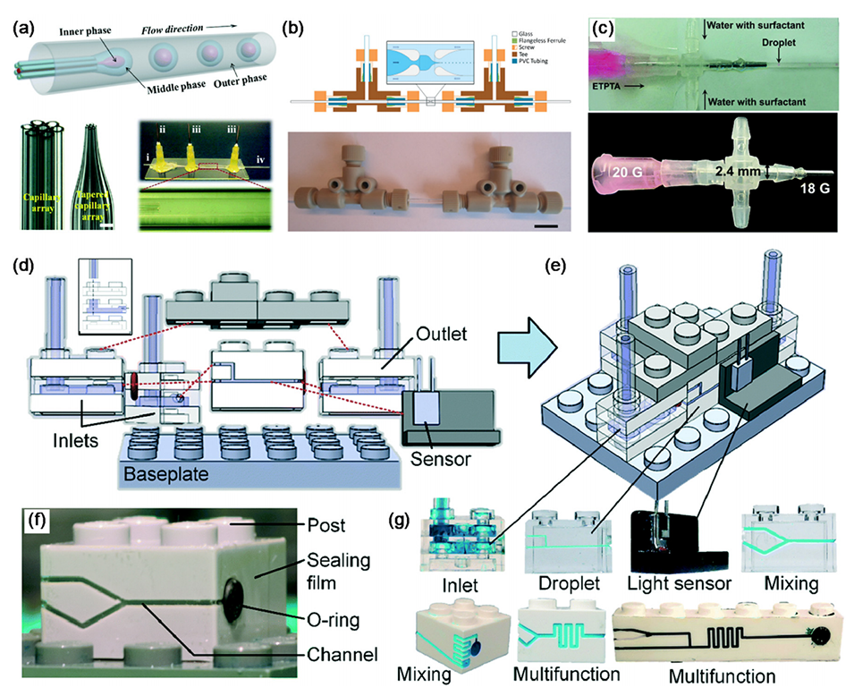 图 7. (a) 毛细管阵列微流控设备的示意图(顶部)和照片(底部)。左下图像中的比例尺:1mm。(b) 用于液滴生成的毛细管组件示意图(顶部)和使用商用组件制成的设备照片(底部)。比例尺:1cm。(c) 由乙氧基化三羟甲基丙烷三丙烯酸酯(ETPTA)制成的液滴生成设备照片。共流设备使用“现成”组件制成。(d) 和 (e) 使用微结构化乐高积木制成的模块化微流控系统示意图。(f) 单个乐高积木的照片,其上有通过微铣削制成的通道,以及用于与相邻积木互连的 O 形圈。背胶聚乙烯膜用作密封膜。(g) 专门设计用于流体操作和分析的不同积木照片:流体入口、液滴生成、透射光检测和混合。