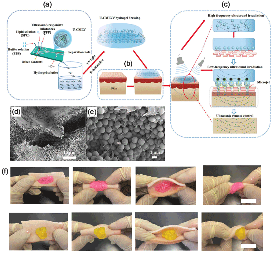 图 10. (a) 用于制备超声控制的单分散脂质囊泡(U-CMLVs)并与水凝胶溶液混合的微流控芯片示意图。(b) U-CMLVs - 水凝胶混合物在皮肤上的应用说明。(c) 高频和低频超声照射结合实现药物释放过程的示意图。(d) 和 (e) 与水凝胶混合的 U-CMLVs 的扫描电子显微镜图像。比例尺:10μm (d) 和 1μm (e)。(f) U-CMLVs - 水凝胶混合物在猪皮上经过扭转、弯曲和拧紧后的照片。顶部(底部)照片所示样品通过添加罗丹明 B(钙黄绿素)获得。比例尺:5cm。