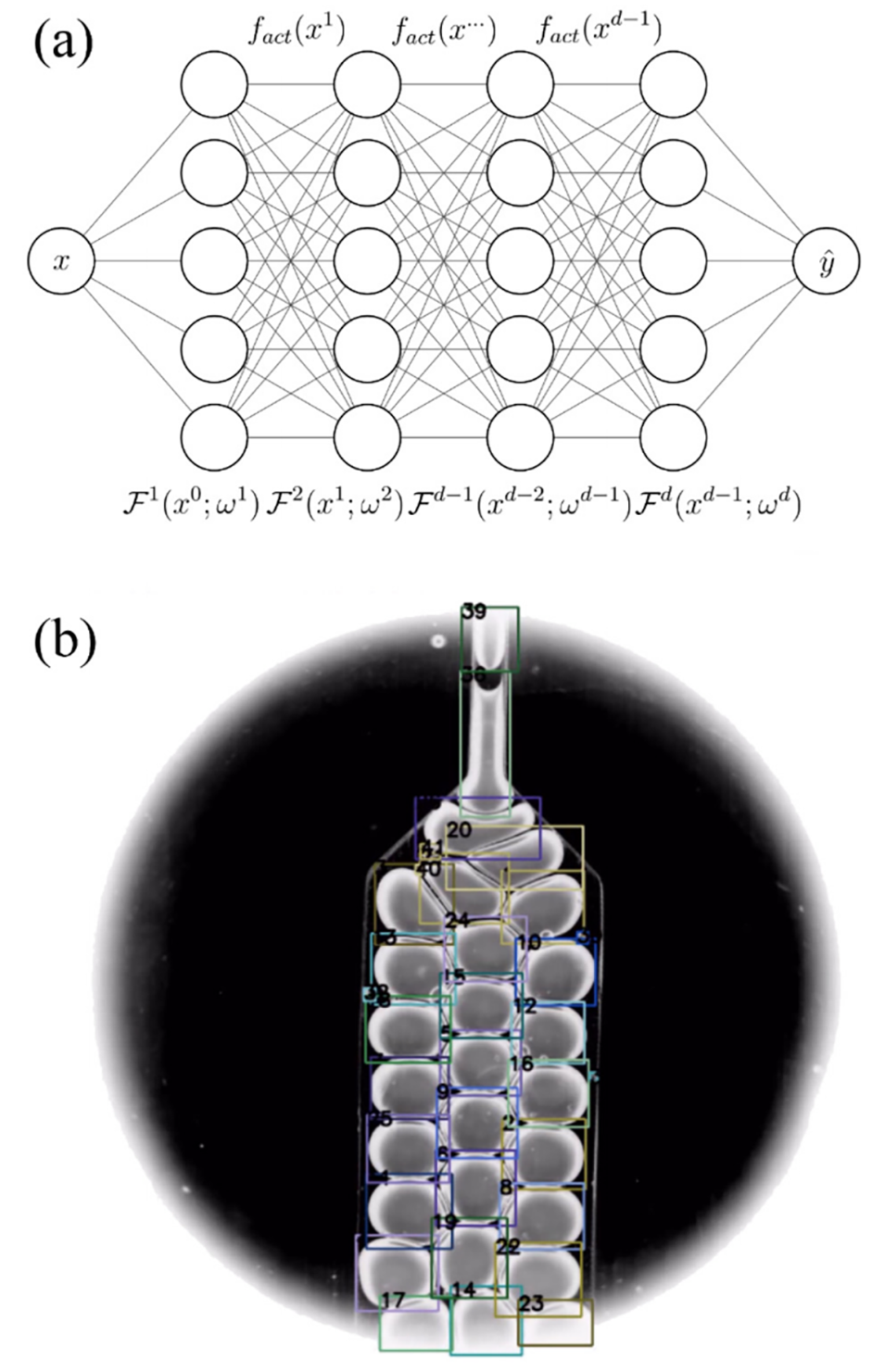 图 11. (a) 用于回归分析的人工神经网络草图,带有式 (15) 和式 (16) 中引入的符号。(b) DropTrack 输出的示例,由人工神经网络对微流控实验快照进行液滴识别得到。