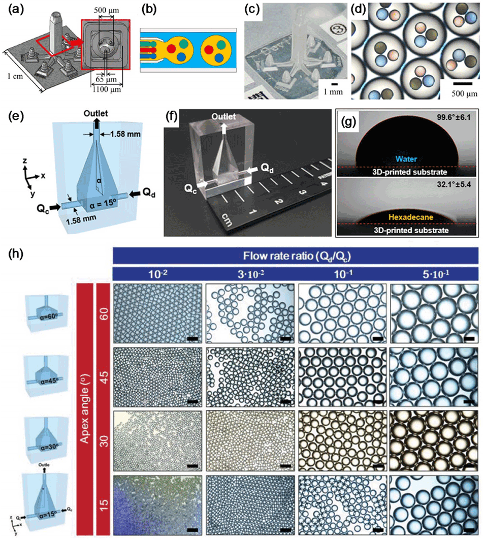 图 13. (a) 用于生成具有三个内液滴的双乳液的微流控设备草图。(b) 具有多个内液滴的双乳液生成机制示意图。(c) 3D 打印设备的照片。(d) 获得的 W/O/W 乳液的光学显微图,具有三个不同的内液滴。(e) 烟囱形液滴生成设备的草图,带有两个用于连续相(Qc)和分散相(Qd)的入口和一个出口。(f) 打印设备的照片。(g) 水(上图)和十六烷(下图)在 3D 打印层上的接触角。(h) 通过改变流量比和顶角生成的 W/O 液滴的光学显微图。比例尺:300μm。设备的示意图显示在左侧。