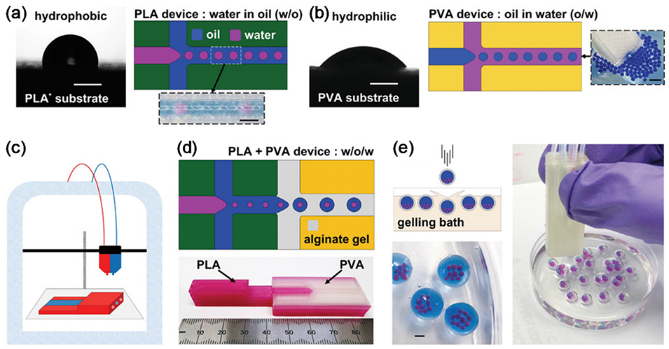 图 16. (a) PLA 3D 打印基板上的水接触角(左图),用于生成 W/O 乳液的 3D 打印 T 型结的示意图和照片。(b) PVA 3D 打印基板上的水接触角,用于生成 O/W 乳液的 T 型结示意图和相应 3D 打印设备生成的 O/W 液滴照片(右图)。(c) 用于打印多种材料的双头挤出机示意图。(d) 由 PVA 和 PLA 制成的 3D 打印设备中 W/O/W 生成的示意图(上图)。下图显示 3D 打印设备的照片。(e) 外层为海藻酸盐的三重乳液照片,当海藻酸盐滴入含有 CaCl₂的浴中时凝胶化,如左上图所示。比例尺:1mm。
