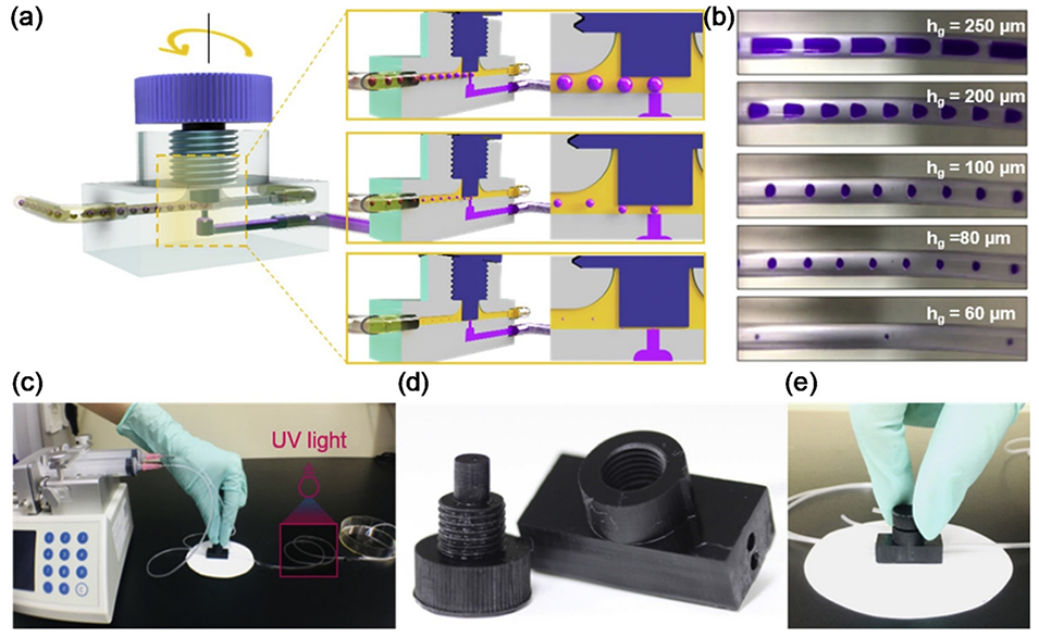 图 14. (a) 用于生成尺寸可控液滴的螺丝 - 螺母装置示意图。(b) 不同 hg 下获得的液滴的光学显微图。(c) 连接到外部泵系统和紫外光源的设备照片,用于生成 PEGDA 微粒。(d) 和 (e) 3D 打印设备的照片。