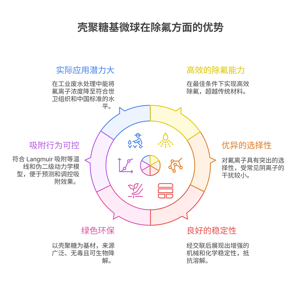 壳聚糖分子中的氨基(−NH2)和羟基(−OH)在酸性条件(如最佳pH=3)下易质子化,使微球表面带正电荷。带正电的表面通过库仑力吸引水中带负电的氟离子(F−),形成静电相互作用,从而将氟离子吸附到微球表面。