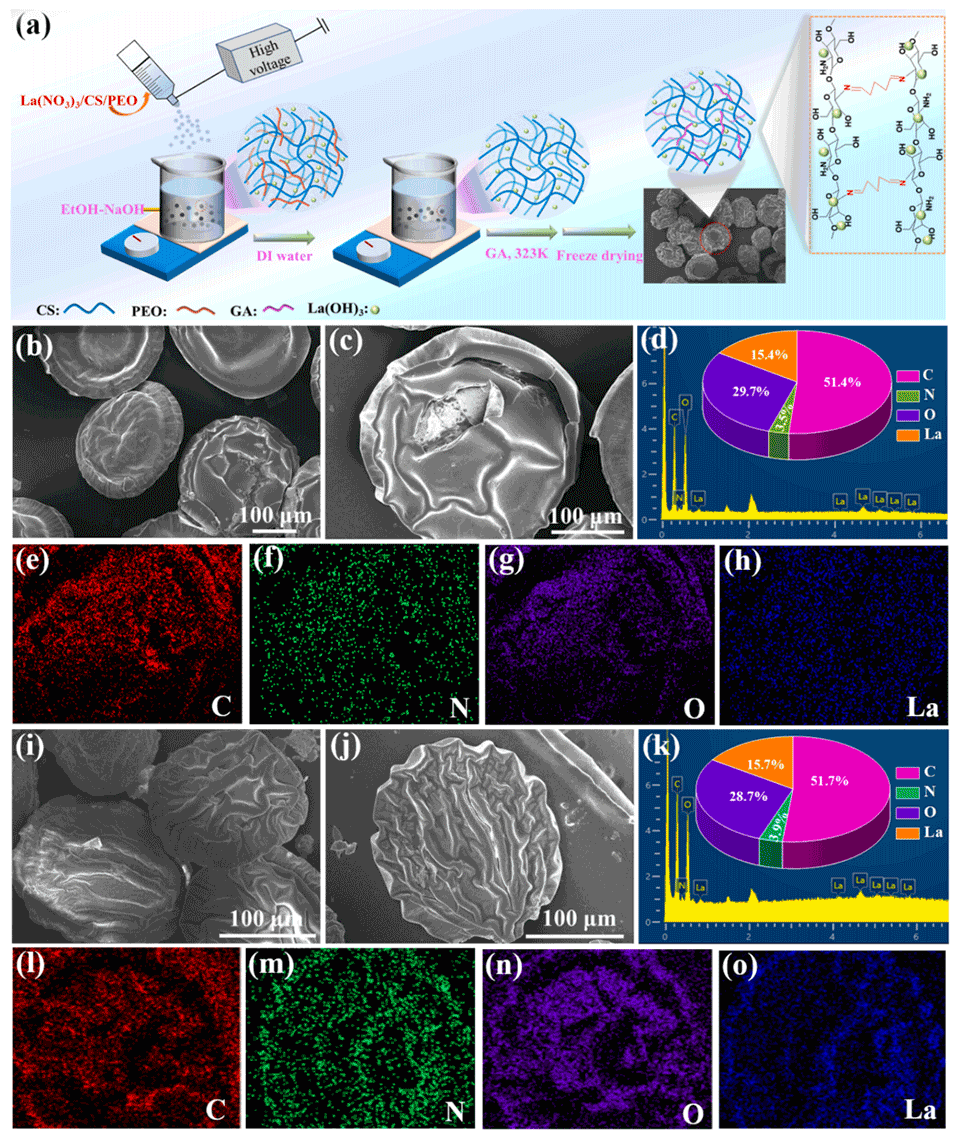 图 1.(a)La(OH)3@GCCSx吸附剂的制备流程图;(b, c)La(OH)3@GCCS2.5−1的扫描电镜图像;(i, j)La(OH)3@GCCS2.5−2的扫描电镜图像;(d-h)La(OH)3@GCCS2.5−1的扫描电镜-能谱分析;(k-o)La(OH)3@GCCS2.5−2的扫描电镜-能谱分析。